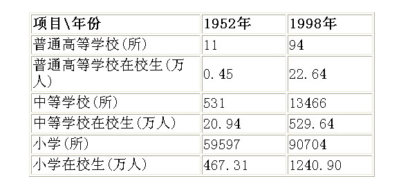 表一: 1998年與1952年少數(shù)民族自治地方教育事業(yè)發(fā)展對(duì)比