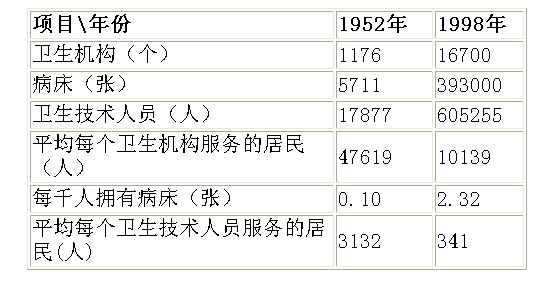 表二:1998年與1952年少數(shù)民族自治地方衛(wèi)生事業(yè)發(fā)展對(duì)比