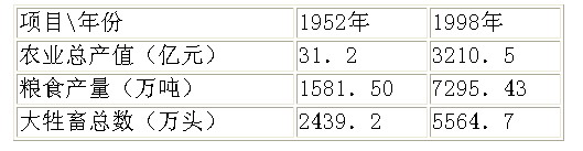 表四:1998年與1952年少數(shù)民族自治地方主要農(nóng)牧業(yè)發(fā)展對(duì)比