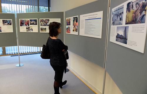 10月21日,在瑞士日內(nèi)瓦萬國宮,一名觀眾觀看《中國人權(quán)成就圖片展》。新華社記者 王思維 攝