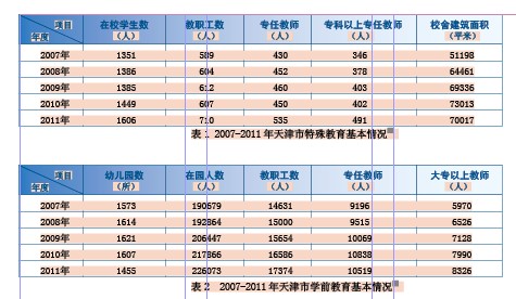 表1的數(shù)據(jù)可以算出,2011年與2007年相比,在校學(xué)生數(shù)增長(zhǎng)了18.9%,教職工數(shù)增長(zhǎng)了20.5%,專任教師增長(zhǎng)了24.4%,專科以上專任教師增長(zhǎng)了41.9%,校舍建筑面積增長(zhǎng)了36.8%,天津市特殊教育的情況有了全方面的快速發(fā)展。