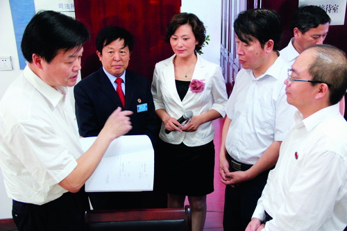 2013年10月,國家司法部領(lǐng)導(dǎo)(前左一)來到劉平林(后左一)所在的司法所調(diào)研指導(dǎo)工作。