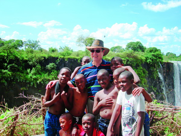 3月27日,在維多利亞大瀑布風(fēng)景區(qū),津巴布韋兒童們紛紛擁上前來(lái)與黃孟復(fù)理事長(zhǎng)合影 慈愛(ài)民 攝