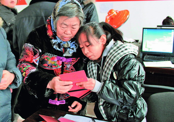 海南區(qū)公烏素鎮(zhèn)利民社區(qū)的工作人員為老年人發(fā)放“一卡通”