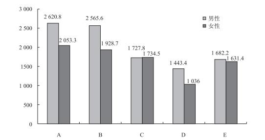 注:其中A代表各種單位的管理者,B代表專業(yè)技術(shù)人員,C代表辦事人員和有關(guān)人員,D代表商業(yè)和服務(wù)業(yè)人員,E代表生產(chǎn)設(shè)備運輸?shù)炔僮魅藛T。