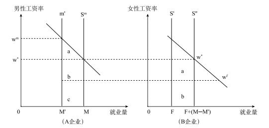 如果任意地加入一種工資差別wm-w*,或在一個產(chǎn)業(yè)中人為地禁止全部雇用男人,由M到M',則產(chǎn)業(yè)A中被取代的男性工人會在原來只雇用婦女的產(chǎn)業(yè)即產(chǎn)業(yè)B中尋找工作。這將使婦女群體的工資下降到wf。留在男性產(chǎn)業(yè)的工人將得到wm-w*的好處,而被取代的男性工人和所有的女性工人的工資將減少w*-wf。勞動力市場就會出現(xiàn)工資差別,不受歧視的群體有所得,被歧視群體有所失,并存在部分的分離。