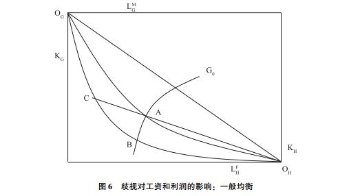 用一般均衡來分析雇主的利潤變化。圖6顯示兩個產(chǎn)業(yè),一個生產(chǎn)資本密集型產(chǎn)品G,另一個生產(chǎn)勞動力密集型產(chǎn)品H,兩個產(chǎn)業(yè)分別投入三種生產(chǎn)要素:資本K,男性勞動力Lm和女性勞動力Lf。在這個埃吉沃斯箱形中,縱軸表示總的資本存量,橫軸表示勞動力存量。
