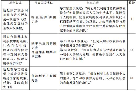 ?、迗D表所統(tǒng)計的有關發(fā)展權的條款,是以明顯出現發(fā)展字樣,或包含明顯的發(fā)展含義的條款為標準的。但實際上,根據憲法理論,即使在經濟、社會和文化權條款中沒有出現發(fā)展字樣或類似的表述,隨著權利保障標準的不斷提升,以及保障幅度的擴大,與發(fā)展權的權利要求是一致的。因而,可以認為,目前一國憲法中,只要包含有經濟、社會和文化權利條款,也就同時可以容納發(fā)展權的內容。