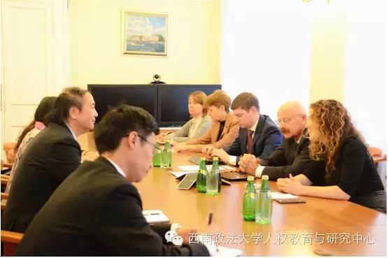 12月5日,訪問團造訪圣彼得堡大學,受到了來自校方的熱情接待。張永和教授先介紹了我校的歷史沿革和人權(quán)中心的師資狀況、研究領(lǐng)域和研究成果的一些概況,并提出了希望加大人權(quán)交流與合作的意向。這一意向得到了圣彼得堡大學分管對外交流與合作事務的副校長AlexanderGogolevsky的充分肯定,他在提出了該校較為成熟的一些國際交流項目后,邀請西南政法大學提供更多的意向性項目方案以作進一步討論。張永和教授和趙樹坤還對圣彼得堡大學現(xiàn)有的人權(quán)教育狀況進行了了解,并就人權(quán)教育對社會的意義進行了溝通,分管副校長聽取意見后表示雙方學校的合作空間很大,期待進一步的商討。