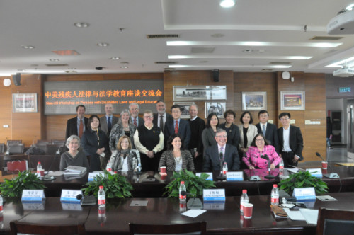 4月14日下午,以美國國務(wù)院國際殘障人權(quán)利特別顧問朱迪斯·休曼女士(Judith E. Heumann)為團長的美國殘障人法律專家代表團一行15人訪問中國人民大學(xué)法學(xué)院,并與該院師生舉行中美殘障人法律與法學(xué)教育座談交流會。韓大元院長、林嘉書記、黎建飛教授、丁相順教授、朱巖教授、鄭愛青副教授、金玄卿副教授、郭銳助理教授、熊丙萬助理教授參加了座談交流會。陸海娜副教授主持本次座談交流會。