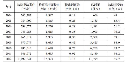 與檢察監(jiān)督一樣,檢察監(jiān)督救濟也貫穿于訴訟的整個過程,適用于所有侵犯訴訟權(quán)利的情形,而對法院侵犯訴訟權(quán)利的救濟,是檢察監(jiān)督救濟的重要組成部分,這部分是建立在檢察機關(guān)對審判程序進行監(jiān)督的基礎(chǔ)上的。但是,檢察機關(guān)對審判程序的監(jiān)督,是檢察監(jiān)督制度中最有爭議的問題,理論上幾乎呈一邊倒的反對態(tài)度,認(rèn)為這種監(jiān)督會扭曲審判的正常構(gòu)造、損害法院的權(quán)威等。⑩正常的審判構(gòu)造呈現(xiàn)的是法官居中裁判、控辯雙方平等對抗的格局,而實行檢察審判監(jiān)督,使得檢察機關(guān)在審判程序中承擔(dān)了兩種角色,一種是控訴者的角色,一種是監(jiān)督者的角色。檢察機關(guān)的這兩種角色是相沖突的,控訴者的角色要求其在審判程序中如一方當(dāng)事人一般,居于法官之下,與辯護方平等對抗,而監(jiān)督者的角色則要求其超越當(dāng)事人的地位,成為法官之上的法官。?兩種相沖突角色集于檢察官一身的制度安排,會導(dǎo)致實質(zhì)上屬于當(dāng)事人一方的檢察機關(guān)凌駕于法官之上,既損害了法官的中立性、權(quán)威性,又破壞了控辯平等對抗的格局。檢察審判監(jiān)督存在的這種結(jié)構(gòu)性問題,必然會在以其為基礎(chǔ)的檢察審判監(jiān)督救濟機制上也存在:按照檢察審判監(jiān)督救濟機制的邏輯,當(dāng)居中裁判者的法院侵犯了被告人的訴訟權(quán)利,被告人請求正與其處于對抗關(guān)系的檢察機關(guān)予以救濟,檢察機關(guān)對法院的審判行為進行審查,通知其糾正違法行為。這種機制造成控訴者成了法官之上的審查官,控訴方成了被告方的“救世主”。這不僅扭曲審判構(gòu)造,而且違背救濟原理。姑且拋開這些結(jié)構(gòu)上的問題不論,而單就其效果而言,也是頗值得懷疑的。雖然理論上檢察機關(guān)并非嚴(yán)格意義上的當(dāng)事人,而是負(fù)有維護法律公正實施因而具有客觀義務(wù)的機關(guān),但由于它在審判程序中具體履行的是控訴職能,因而實質(zhì)上屬于一方當(dāng)事人,與另一方當(dāng)事人即被告方實際上處于對抗關(guān)系。檢察機關(guān)與被告人在審判程序中的這種關(guān)系意味著,當(dāng)法院侵犯被告人的訴訟權(quán)利時,檢察機關(guān)怎么可能會冒著得罪法院的風(fēng)險而為其對手提供救濟呢?而被告人只要有正常思維,又怎么會向其對手請求救濟呢?而檢察審判監(jiān)督的司法實踐已經(jīng)證明了這種不可能。下表是近年來全國檢察審判監(jiān)督的情況:?