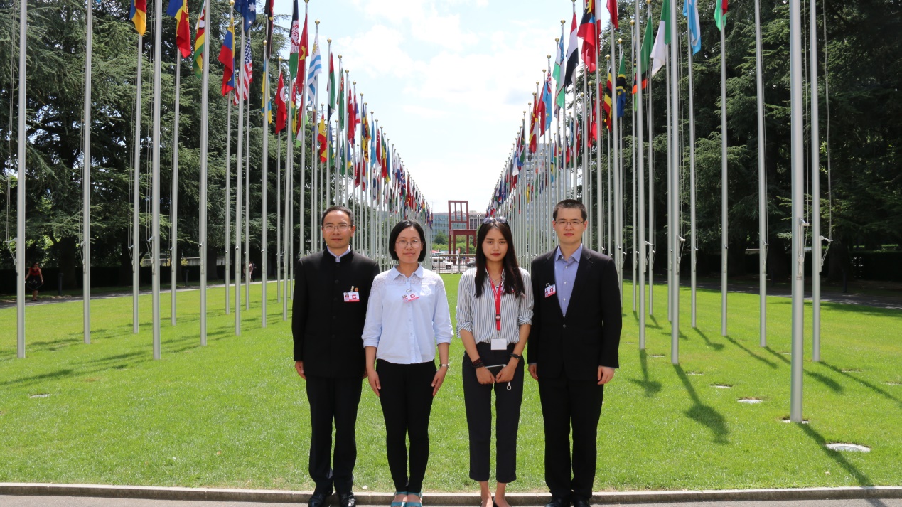 (復(fù)旦代表隊在聯(lián)合國日內(nèi)瓦總部萬國旗下集體合影)