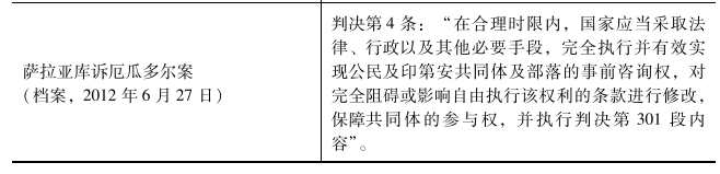 再如,在阿瓦斯·提格尼(Awas Tigni)案中,尼加拉瓜修改了《土地法》以及《憲法》中的保障印第安共同體公用地享有和支配權(quán)條款。同時(shí),最高法院在2007年2月27日判決中宣布,關(guān)于阿瓦斯·提格尼共同體印第安人土地,政府的林業(yè)開發(fā)的土地占有行為違憲?!?9】在薩拉亞庫(kù)案之后,2012年7月19日,秘魯行政機(jī)關(guān)通過的第1247號(hào)最高法令規(guī)定:“在資源性地塊開發(fā)權(quán)投標(biāo)與公布中標(biāo)過程中,執(zhí)行事前咨詢自由和信息公開。”