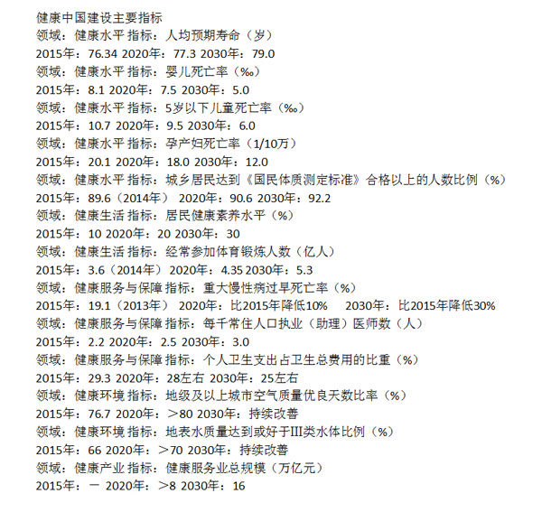 為了更好地保障人民群眾的健康權(quán),中國(guó)正在加緊推進(jìn)健康中國(guó)建設(shè),已制定實(shí)施《“健康中國(guó)2030”規(guī)劃綱要》《全民健身計(jì)劃(2016-2020年)》《“十三五”衛(wèi)生與健康規(guī)劃》《“十三五”深化醫(yī)藥衛(wèi)生體制改革規(guī)劃》等一系列規(guī)劃綱要,并提出“三步走”的目標(biāo),即到2020年,建立覆蓋城鄉(xiāng)居民的中國(guó)特色基本醫(yī)療衛(wèi)生制度,主要健康指標(biāo)居于中高收入國(guó)家前列;到2030年,促進(jìn)全民健康的制度體系更加完善,主要健康指標(biāo)進(jìn)入高收入國(guó)家行列;到2050年,建成與社會(huì)主義現(xiàn)代化國(guó)家相適應(yīng)的健康國(guó)家。中國(guó)各級(jí)政府將繼續(xù)以高度的責(zé)任感和緊迫感,努力全方位、全周期保障人民健康,奮力推動(dòng)衛(wèi)生與健康事業(yè)全面發(fā)展。