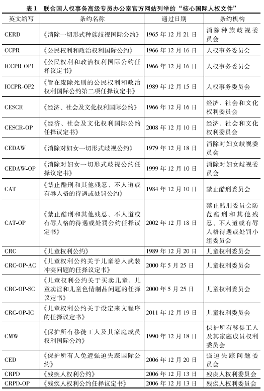 盡管該網(wǎng)站并沒有對(duì)“聯(lián)合國(guó)核心人權(quán)公約”的標(biāo)準(zhǔn)做出明確解釋,但我們可以從聯(lián)合國(guó)出版物《核心國(guó)際人權(quán)條約》和聯(lián)合國(guó)人權(quán)事務(wù)高級(jí)專員辦公室官方網(wǎng)站上的列舉來(lái)歸納“聯(lián)合國(guó)核心人權(quán)公約”的形式共性。