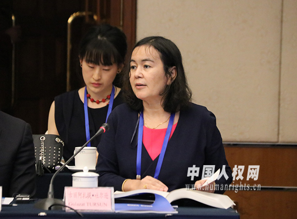 四川大學中國西部邊疆安全與發(fā)展協(xié)調(diào)創(chuàng)新中心教授古麗阿扎提·吐爾遜做論壇發(fā)言。(馬陽陽攝)