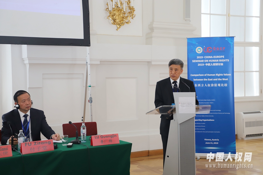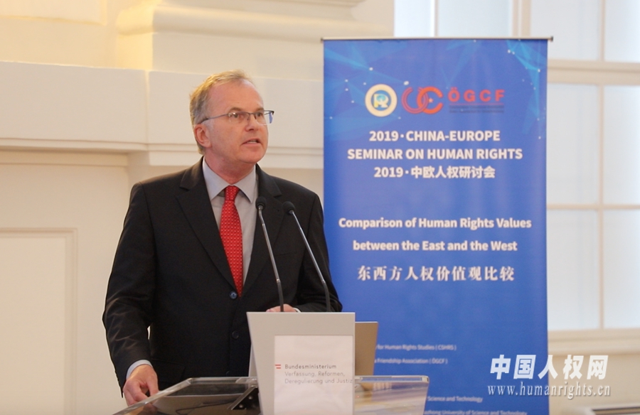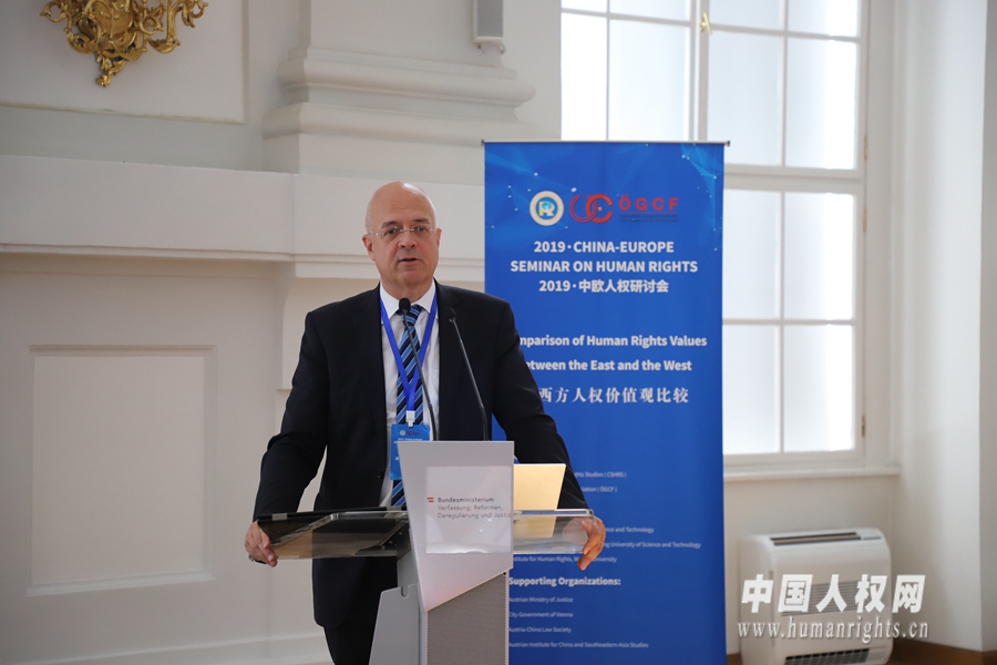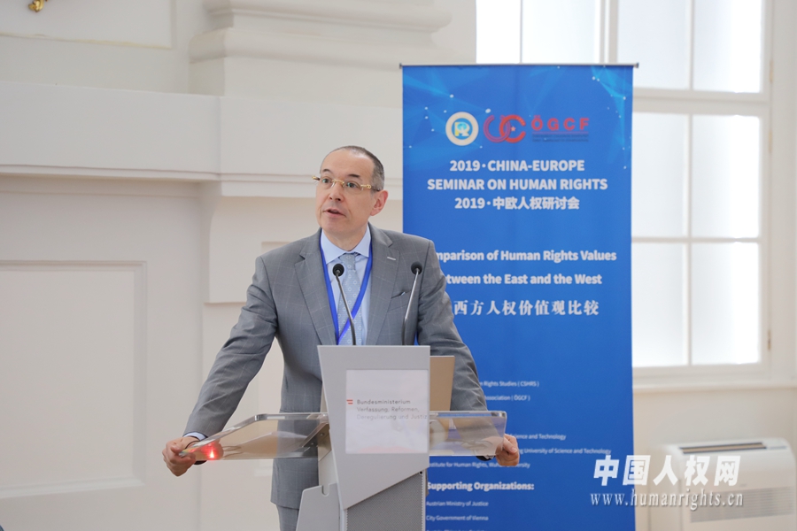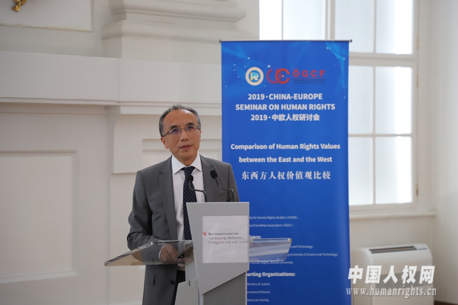 6月21日,由中國人權(quán)研究會(huì)和奧中友好協(xié)會(huì)共同舉辦的“2019·中歐人權(quán)研討會(huì)”在奧地利司法部舉行。研討會(huì)主題為“東西方人權(quán)價(jià)值觀比較”。”來自中歐人權(quán)領(lǐng)域的近100位專家學(xué)者、政府官員、社會(huì)組織代表圍繞人權(quán)的普遍性與特殊性、人類命運(yùn)共同體的人權(quán)意義、人權(quán)價(jià)值觀的歷史及其演變、新中國的人權(quán)實(shí)踐及其世界意義等內(nèi)容進(jìn)行了討論。