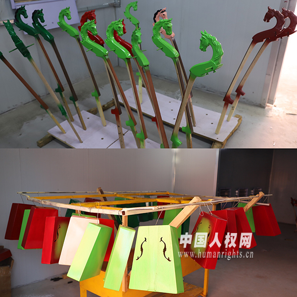 馬頭琴是一種蒙古民間拉弦樂器,有梯形的琴身和雕刻成馬頭形狀的琴柄。圖為拼版照片噴漆后正在晾干階段的馬頭琴,艷芳正在打磨的就是雕刻成馬頭形狀的琴柄。(攝影/賈璞玉)