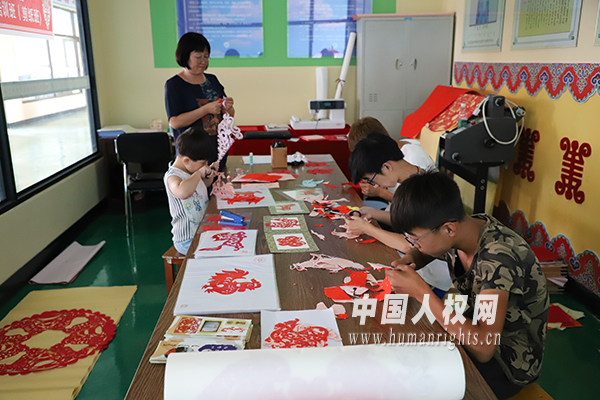 圖為學(xué)生們在剪紙工作室學(xué)習(xí)剪紙。(攝影/賈璞玉)