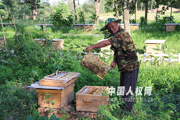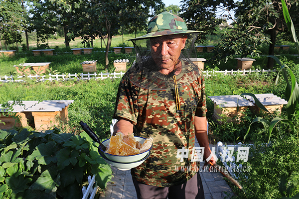 李戰(zhàn)文滿臉幸福地向記者展示自己養(yǎng)殖的蜜蜂。(攝影/陳可)