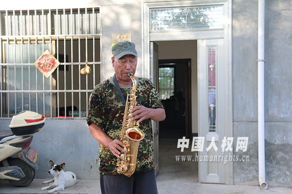 李戰(zhàn)文站在自己的新家前給記者演奏薩克斯。(攝影/陳可)