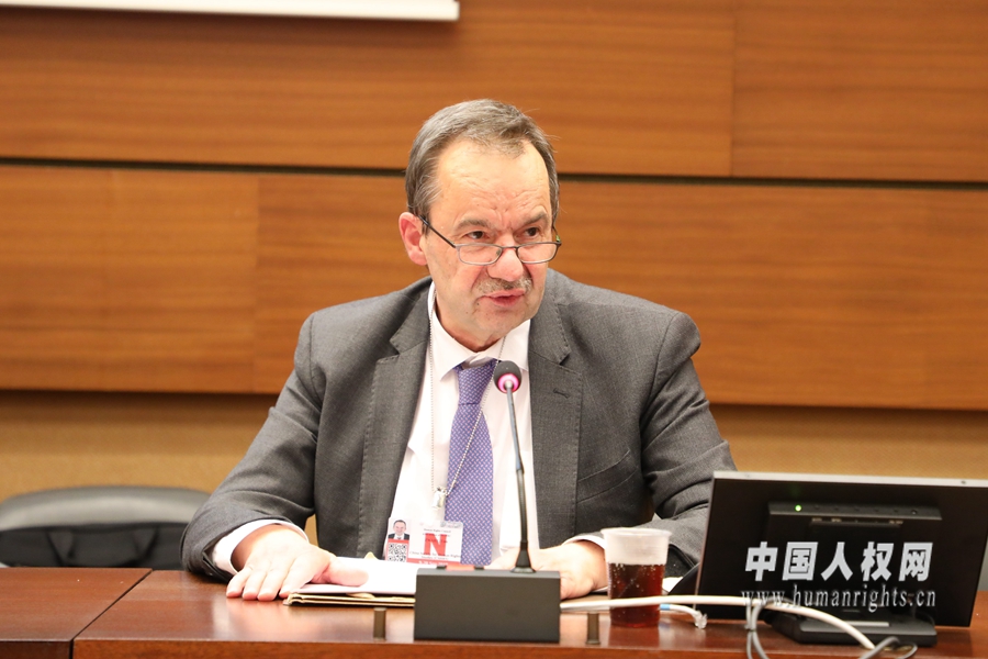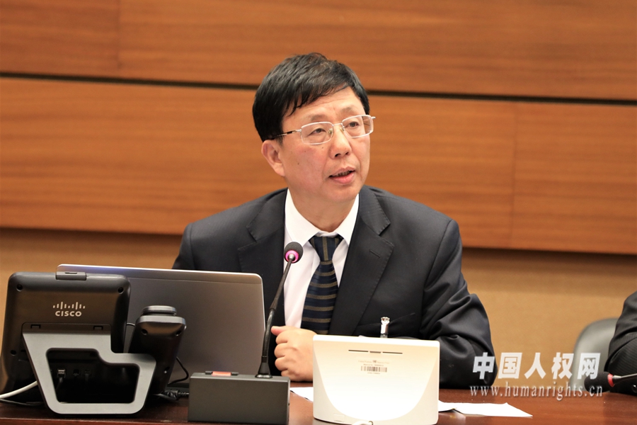 9月9日,中國(guó)人權(quán)研究會(huì)在日內(nèi)瓦萬(wàn)國(guó)宮舉辦“新中國(guó)人權(quán)事業(yè)發(fā)展70年”主題邊會(huì),南開(kāi)大學(xué)人權(quán)研究中心主任常健在會(huì)上發(fā)言。攝影:石冬冬 南開(kāi)大學(xué)人權(quán)研究中心主任常健在會(huì)上介紹了具有中國(guó)特色的“發(fā)展主義”的人權(quán)道路。他表示,新中國(guó)成立70年來(lái),經(jīng)過(guò)不斷探索,吸取經(jīng)驗(yàn)教訓(xùn),走出了以發(fā)展促人權(quán)、實(shí)現(xiàn)人的全面發(fā)展的成功道路。中國(guó)不僅將“國(guó)家尊重和保障人權(quán)”寫(xiě)入憲法,而且制定了三期國(guó)家人權(quán)行動(dòng)計(jì)劃,將經(jīng)濟(jì)、政治、社會(huì)和文化發(fā)展與人權(quán)發(fā)展結(jié)合起來(lái),并采取了一系列相應(yīng)的政策措施。從實(shí)踐結(jié)果來(lái)看,中國(guó)經(jīng)濟(jì)、政治、社會(huì)和文化的發(fā)展與人權(quán)保障水平的提升呈現(xiàn)出同步性。