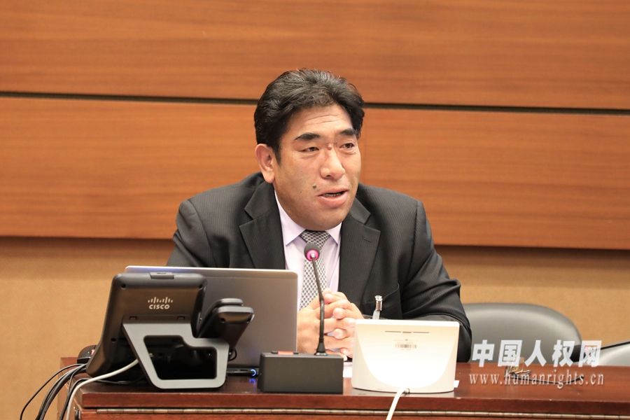 9月9日,中國(guó)人權(quán)研究會(huì)在日內(nèi)瓦萬(wàn)國(guó)宮舉辦“新中國(guó)人權(quán)事業(yè)發(fā)展70年”主題邊會(huì),中國(guó)藏學(xué)研究中心研究員晉哲旺久在會(huì)上發(fā)言。攝影:石冬冬 中國(guó)藏學(xué)研究中心研究員晉哲旺久在會(huì)上以西藏為例介紹了新中國(guó)少數(shù)民族的權(quán)益保障。他表示,在中國(guó)各民族不論人口多少,經(jīng)濟(jì)社會(huì)發(fā)展程度高低,風(fēng)俗習(xí)慣和宗教信仰異同,都是中華民族的一部分,具有同等的地位。各民族平等參與國(guó)家事務(wù)的管理,國(guó)家保護(hù)并尊重各民族宗教信仰、使用和發(fā)展少數(shù)民族語(yǔ)言文字的自由。中央政府和西藏自治區(qū)各級(jí)政府高度重視和保護(hù)發(fā)展西藏傳統(tǒng)文化。采取了一系列尊重、保護(hù)和繁榮民族傳統(tǒng)文化的政策和措施,使西藏文化得到繼承和發(fā)展。