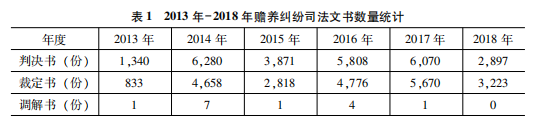 表1  2013年2018年贍養(yǎng)糾紛司法文書(shū)數(shù)量統(tǒng)計(jì)