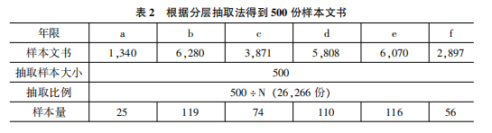 鑒于第一次樣本文書(shū)數(shù)量龐大,結(jié)合文章的體量大小,按照分層抽樣法,進(jìn)行第二次抽樣。首先,設(shè)定樣本的大小為500份判決書(shū),然后將六年來(lái)所有案由是“贍養(yǎng)糾紛”的判決書(shū)的總份數(shù)26,266份=N,并按照年限分為6個(gè)不同的子總體(2013=a,2014=b,2015=c,2016=d,2017=e,2018=f),從分好的各個(gè)子總體中,按500÷N=500/N的比例從各層中抽取樣本,即得出每一年需要抽取的樣本文書(shū)量。見(jiàn)表2。