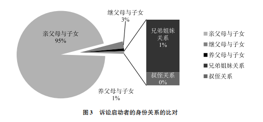從樣本的起訴主體看,贍養(yǎng)糾紛訴訟的發(fā)起者(提起訴訟的原告)主要是老年人⑥,贍養(yǎng)糾紛的權(quán)利主體主要限定在父母與子女這樣的親緣結(jié)構(gòu)和社會(huì)關(guān)系中??傮w來(lái)說(shuō),父母子女關(guān)系占比約95%,繼父母子女關(guān)系占比約3%,養(yǎng)父母子女關(guān)系占比約1%,兄弟姐妹關(guān)系占比約1%,另外還有1個(gè)案例是叔侄之間約定的贍養(yǎng)關(guān)系出現(xiàn)問(wèn)題而提起的訴訟。見(jiàn)圖3。