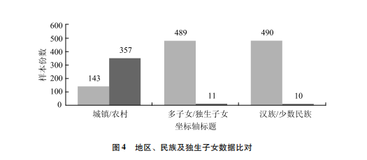 從樣本的地域分布看,農(nóng)村地區(qū)老年人起訴到法院的有357份,占比為71.4%,城鎮(zhèn)地區(qū)老年人起訴到法院的有143份,占比為28.6%。其中,有11份獨(dú)生子女家庭的樣本,在統(tǒng)計(jì)中占比為2.2%,而多子女家庭的有489份,占比97.8%。另外,漢族家庭占比98%與少數(shù)民族家庭占比2%。⑦綜上,可以看出,農(nóng)村地區(qū)案件量大于城市,多子女家庭的贍養(yǎng)糾紛遠(yuǎn)超獨(dú)生子女家庭,漢族家庭起訴的案件遠(yuǎn)多于少數(shù)民族家庭。見(jiàn)圖4。