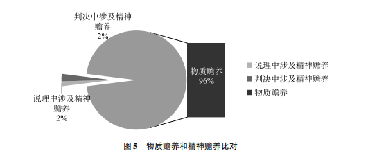從樣本的訴訟請(qǐng)求看,物質(zhì)需求仍是老年人權(quán)益的重要方面。樣本中,老年人所提起的訴求關(guān)于物質(zhì)贍養(yǎng)占比約96%,包括但不限于贍養(yǎng)費(fèi)、醫(yī)療費(fèi)、護(hù)理費(fèi)、喪葬費(fèi)等,以及要求子女照顧生活起居、要求提供適宜居住的住房、要求居住到養(yǎng)老院或類似機(jī)構(gòu)。而精神贍養(yǎng)占比約4%,老年人在訴求中直接提及并且法院直接判決占比約2%,說(shuō)理中涉及精神贍養(yǎng)的占比約2%。見(jiàn)圖5。另外,判決中精神贍養(yǎng)的主要實(shí)現(xiàn)方式是通過(guò)定期的探視或問(wèn)候。