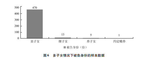 司法途徑來(lái)解決的贍養(yǎng)糾紛,前提是權(quán)責(zé)要明確,通過(guò)司法裁判強(qiáng)制贍養(yǎng)人積極履行義務(wù)。通常贍養(yǎng)糾紛爭(zhēng)議的焦點(diǎn)在于——究竟誰(shuí)負(fù)有贍養(yǎng)義務(wù)和負(fù)擔(dān)怎樣的贍養(yǎng)義務(wù)?這種問(wèn)題,在多子女的情況下表現(xiàn)得最為突出。樣本中⑧被告主要是老年人的子女,其中親生子女為470份、繼子女為13份、養(yǎng)子女為5份,以及約定形成的贍養(yǎng)關(guān)系為1份(如圖6)。由此可知,形成了法定的父母子女關(guān)系的情況下,子女就自然成為法定贍養(yǎng)人,依法應(yīng)當(dāng)履行贍養(yǎng)義務(wù)。樣本中涉及的1份約定贍養(yǎng),是叔侄之間的約定贍養(yǎng),爭(zhēng)議點(diǎn)是關(guān)于贍養(yǎng)關(guān)系的解除。