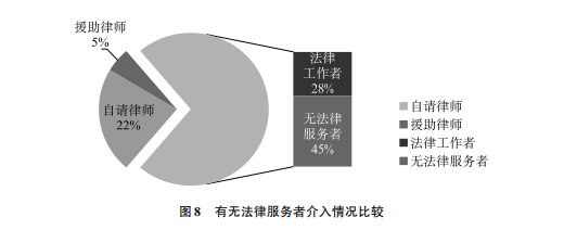 首先,訴訟過(guò)程中缺乏專業(yè)法律服務(wù)者的介入,未能形成理想中的對(duì)抗制模式。如圖8所示,老年人贍養(yǎng)糾紛中,占比45%的案件都是老年人親自出庭、或者其親屬作為法定代理人或委托代理人出庭,而律師或法律工作者尚未充分介入案件中。