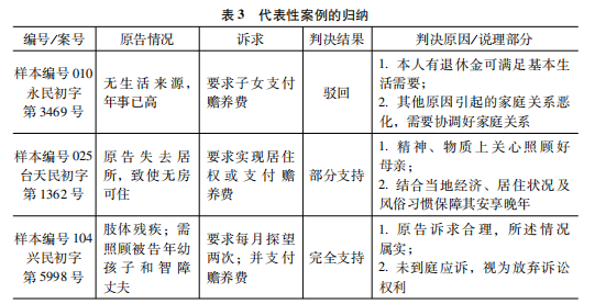 其次,從裁判規(guī)則角度看,訴訟過(guò)程中法律規(guī)則、社會(huì)習(xí)慣、道德等多元規(guī)范共同使用。樣本顯示,法官通常會(huì)依照《民事訴訟法》《最高人民法院關(guān)于民事訴訟證據(jù)的若干規(guī)定》《老年人權(quán)益保障法》《婚姻法》等法律及司法解釋中的法律原則和規(guī)則進(jìn)行分析說(shuō)理,從而評(píng)定當(dāng)事人的行為,謹(jǐn)慎地排除其他干擾性因素,得出令人信服的結(jié)論。同時(shí),法官的論述中常會(huì)包含當(dāng)?shù)厣鐣?huì)習(xí)慣、風(fēng)俗情況,以及當(dāng)?shù)亟?jīng)濟(jì)發(fā)展實(shí)際情況,綜合考慮當(dāng)事人的情感需要,在裁量限度內(nèi)盡量保證判決結(jié)果能夠讓各方當(dāng)事人認(rèn)同。表3選取了10個(gè)代表性文書(shū)對(duì)此予以說(shuō)明。