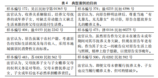 同時(shí),法官在判決案件時(shí)存在一些“同案不同判”的情況,以及對(duì)法律理解上的差異。樣本中有這種情況:一般民眾可能認(rèn)可倘若父母在子女未成年時(shí)未盡到撫養(yǎng)義務(wù),在父母年老后成年子女可以不履行贍養(yǎng)義務(wù)。但法官的判斷多與此不同,甚至是沖突性的,有的法官認(rèn)為要承擔(dān)責(zé)任,有的認(rèn)為不承擔(dān)。另外,戶籍認(rèn)可上的差異,即使老年人本身屬于農(nóng)村戶籍或者生活在農(nóng)村,如果其贍養(yǎng)義務(wù)人的贍養(yǎng)能力達(dá)到城鎮(zhèn)水準(zhǔn),法官會(huì)盡量采用更高的城鎮(zhèn)標(biāo)準(zhǔn)進(jìn)行判定。見(jiàn)表4。