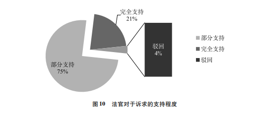 司法裁判的結(jié)果是每位當(dāng)事人最重視的一環(huán),也是司法救濟(jì)途徑是否起到效果的重要檢測(cè)標(biāo)準(zhǔn)。不管是原告,還是被告,他們主要關(guān)注自身的訴求或抗辯能否得到法院的支持。從樣本看,對(duì)于原告訴求部分支持的占比約75%,而完全支持占比約22%,被駁回的訴求占比約3%(如圖10)??梢?jiàn),老年人的合法權(quán)益受到司法保障的可能性很高。