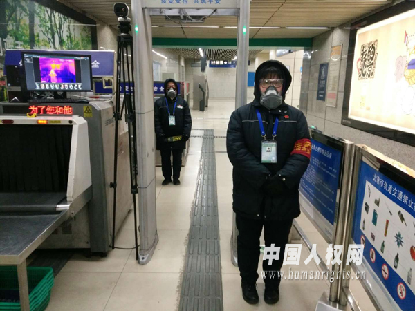 眾所周知地鐵站是人流密集場所,是疫情防控的重點區(qū)域,地鐵安檢隊員中,涌現(xiàn)出一批忠于職守,義無反顧奮戰(zhàn)在一線抗擊疫情的“地鐵衛(wèi)士"。進入地鐵站,就會看到“請佩戴口罩”這幾個大字,緊接著就會有一位地鐵安檢人員對你說:“您好,防疫要求,檢測體溫,請配合”。 “謝謝配合,請安檢進站”。這是安檢員們每天說的最多的兩句話。中國人權(quán)網(wǎng)記者采訪了一位安檢員,他說:“每天在客流量大、人員密集的地鐵站工作,疫情發(fā)生后,心里也會有壓力,家里也會有人擔心,但我沒有退縮,作為一名安檢員,每天按時出勤,盡心服務每一個乘客,在做好自身防護的同時,幫助乘客樹立積極的心態(tài),防疫期間,佩戴好手套、口罩,為做好防控貢獻出自己的一份力量,努力保障每一位進站乘客的安全。”