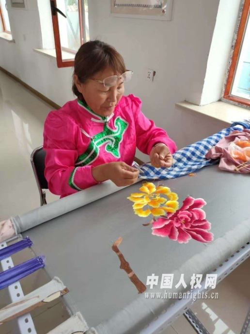 圖為白吉林白乙拉妻子在刺繡。受訪者供圖。