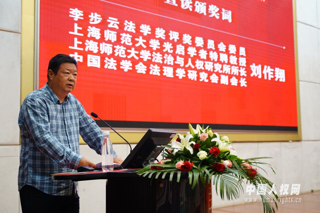 李步云法學(xué)獎評獎委員會委員、上海師范大學(xué)光啟學(xué)者特聘教授、上海師范大學(xué)法治與人權(quán)研究所所長、中國法學(xué)會法理學(xué)研究會副會長劉作翔宣讀湯姆·茨瓦特教授的頒獎詞。(賀明 攝)
