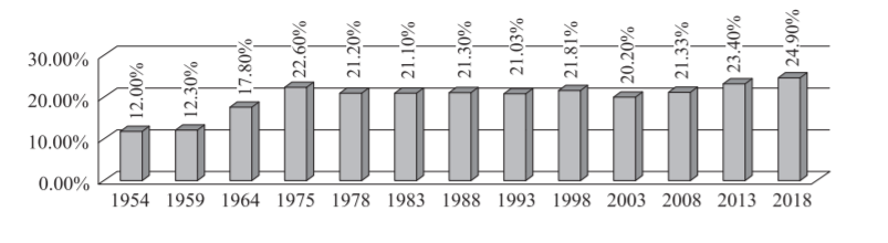 立法活動中婦女的缺失是立法性別盲視的直接體現(xiàn)。中國歷史的較長時間里,法律由男性官員主導(dǎo)制定,體現(xiàn)的也是屬于他們的利益和需要;新中國成立后,各級人民代表大會中也有婦女代表的身影,但在男性占據(jù)主導(dǎo)地位的立法機構(gòu)里,婦女的聲音很難體現(xiàn)到立法中;即便在今天,也很難說婦女的聲音充分融入到了法律法規(guī)的內(nèi)容中。“婦女參與立法活動是一種立法參與的權(quán)利獲得,目的在于平等分享立法意志的表達(dá)權(quán),以影響利益的性別平等分配”。現(xiàn)實的情況卻是:婦女在全國人大代表中仍是少數(shù),中國婦女參與立法的情況并不樂觀,(圖1)。