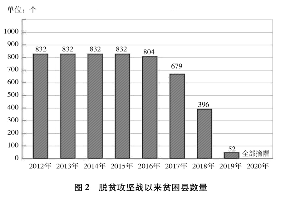 中共十八大以來,經(jīng)過8年持續(xù)奮斗,到2020年底,中國(guó)如期完成新時(shí)代脫貧攻堅(jiān)目標(biāo)任務(wù),現(xiàn)行標(biāo)準(zhǔn)下9899萬農(nóng)村貧困人口全部脫貧(圖1),832個(gè)貧困縣全部摘帽(圖2),12.8萬個(gè)貧困村全部出列,區(qū)域性整體貧困得到解決,完成消除絕對(duì)貧困的艱巨任務(wù)。