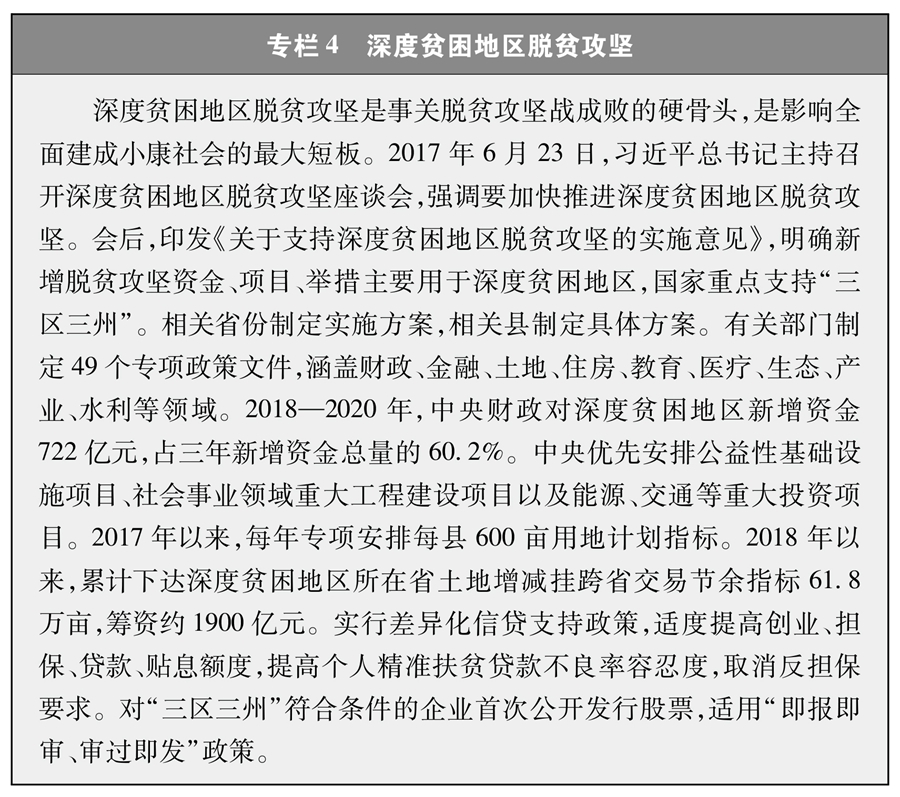 深度貧困地區(qū)是貧中之貧、堅(jiān)中之堅(jiān)。通過脫貧攻堅(jiān),“三區(qū)三州”⑨等深度貧困地區(qū)突出問題得到根本解決,基礎(chǔ)設(shè)施和公共服務(wù)水平顯著提升,特色主導(dǎo)產(chǎn)業(yè)加快發(fā)展,社會(huì)文明程度明顯提高,區(qū)域性整體貧困問題徹底解決(專欄4)。