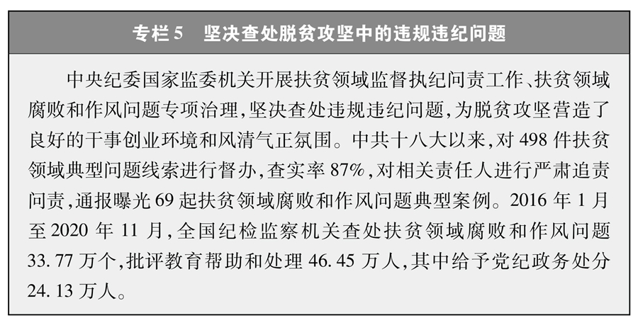 脫貧攻堅(jiān)涉及面廣、要素繁多、極其復(fù)雜,需要強(qiáng)有力的組織領(lǐng)導(dǎo)和貫徹執(zhí)行。充分發(fā)揮黨的政治優(yōu)勢(shì)、組織優(yōu)勢(shì),建立中央統(tǒng)籌、省負(fù)總責(zé)、市縣抓落實(shí)的脫貧攻堅(jiān)管理體制和片為重點(diǎn)、工作到村、扶貧到戶的工作機(jī)制,構(gòu)建起橫向到邊、縱向到底的工作體系。各級(jí)黨委充分發(fā)揮總攬全局、協(xié)調(diào)各方的作用,執(zhí)行脫貧攻堅(jiān)一把手負(fù)責(zé)制,中西部22個(gè)省份黨政主要負(fù)責(zé)同志向中央簽署責(zé)任書、立下軍令狀,省市縣鄉(xiāng)村五級(jí)書記一起抓。脫貧攻堅(jiān)期內(nèi),貧困縣黨委政府正職保持穩(wěn)定。有脫貧任務(wù)的地區(qū),倒排工期、落實(shí)責(zé)任,抓緊施工、強(qiáng)力推進(jìn)。脫貧攻堅(jiān)任務(wù)重的地區(qū),把脫貧攻堅(jiān)作為頭等大事和第一民生工程,以脫貧攻堅(jiān)統(tǒng)攬經(jīng)濟(jì)社會(huì)發(fā)展全局。實(shí)行最嚴(yán)格的考核評(píng)估和監(jiān)督檢查,組織脫貧攻堅(jiān)專項(xiàng)巡視,開展扶貧領(lǐng)域腐敗和作風(fēng)問題專項(xiàng)治理(專欄5),加強(qiáng)脫貧攻堅(jiān)督導(dǎo)和監(jiān)察(專欄6),確保扶貧工作務(wù)實(shí)、脫貧過程扎實(shí)、脫貧結(jié)果真實(shí),使脫貧攻堅(jiān)成果經(jīng)得起實(shí)踐和歷史檢驗(yàn)。建立健全干部擔(dān)當(dāng)作為的激勵(lì)和保護(hù)機(jī)制,加大關(guān)心關(guān)愛干部力度,樹立正確用人導(dǎo)向,引導(dǎo)廣大干部在決勝脫貧攻堅(jiān)中奮發(fā)有為、履職盡責(zé)。加強(qiáng)基層扶貧隊(duì)伍建設(shè),普遍建立干部駐村幫扶工作隊(duì)制度,按照因村派人、精準(zhǔn)選派的原則,選派政治素質(zhì)好、工作能力強(qiáng)、作風(fēng)實(shí)的干部駐村扶貧。廣大駐村干部牢記使命、不負(fù)重托,心系貧困群眾,扎根基層扶貧一線,傾心傾力幫助貧困群眾找出路、謀發(fā)展、早脫貧。從2013年開始向貧困村選派第一書記和駐村工作隊(duì),到2015年,實(shí)現(xiàn)每個(gè)貧困村都有駐村工作隊(duì)、每個(gè)貧困戶都有幫扶責(zé)任人。截至2020年底,全國(guó)累計(jì)選派25.5萬個(gè)駐村工作隊(duì)、300多萬名第一書記和駐村干部,同近200萬名鄉(xiāng)鎮(zhèn)干部和數(shù)百萬村干部一道奮戰(zhàn)在扶貧一線。
