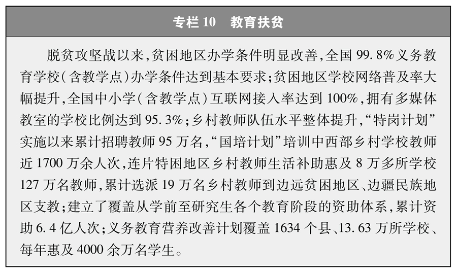 發(fā)展教育脫貧一批。堅(jiān)持再窮不能窮教育、再窮不能窮孩子,加強(qiáng)教育扶貧,不讓孩子輸在起跑線上,努力讓每個(gè)孩子都有人生出彩的機(jī)會(huì),阻斷貧困代際傳遞(專欄10)。持續(xù)提升貧困地區(qū)學(xué)校、學(xué)位、師資、資助等保障能力,20多萬名義務(wù)教育階段的貧困家庭輟學(xué)學(xué)生全部返校就讀,全面實(shí)現(xiàn)適齡少年兒童義務(wù)教育有保障。實(shí)施定向招生、學(xué)生就業(yè)、職教脫貧等傾斜政策,幫助800多萬貧困家庭初高中畢業(yè)生接受職業(yè)教育培訓(xùn)、514萬名貧困家庭學(xué)生接受高等教育,重點(diǎn)高校定向招收農(nóng)村和貧困地區(qū)學(xué)生70多萬人,拓寬貧困學(xué)生縱向流動(dòng)渠道。開展民族地區(qū)農(nóng)村教師和青壯年農(nóng)牧民國(guó)家通用語言文字培訓(xùn),累計(jì)培訓(xùn)350萬余人次,提升民族地區(qū)貧困人口就業(yè)能力。“學(xué)前學(xué)會(huì)普通話”行動(dòng)先后在四川省涼山彝族自治州和樂山市馬邊彝族自治縣、峨邊彝族自治縣、金口河區(qū)開展試點(diǎn),覆蓋43萬學(xué)齡前兒童,幫助他們學(xué)會(huì)普通話。