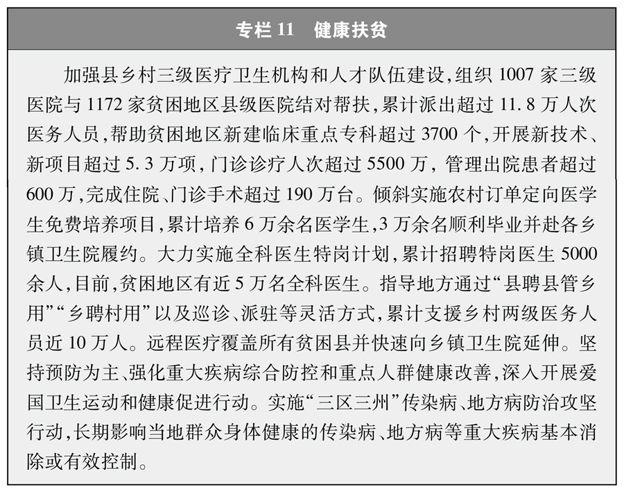 中國(guó)還結(jié)合實(shí)際、因地制宜,采取其他多渠道多元化扶貧措施。大力推進(jìn)就業(yè)扶貧,通過免費(fèi)開展職業(yè)技能培訓(xùn)、東西部扶貧協(xié)作勞務(wù)輸出、扶貧車間和扶貧龍頭企業(yè)吸納、返鄉(xiāng)創(chuàng)業(yè)帶動(dòng)、扶貧公益性崗位安置等形式,支持有勞動(dòng)能力的貧困人口在本地或外出務(wù)工、創(chuàng)業(yè),貧困勞動(dòng)力務(wù)工規(guī)模從2015年的1227萬人增加到2020年的3243萬人。開展健康扶貧工程,把健康扶貧作為脫貧攻堅(jiān)重要舉措,防止因病致貧返貧(專欄11)。深入實(shí)施網(wǎng)絡(luò)扶貧工程,支持貧困地區(qū)特別是“三區(qū)三州”等深度貧困地區(qū),完善網(wǎng)絡(luò)覆蓋,推進(jìn)“互聯(lián)網(wǎng)+”扶貧模式。實(shí)施資產(chǎn)收益扶貧,把中央財(cái)政專項(xiàng)扶貧資金和其他涉農(nóng)資金投入設(shè)施農(nóng)業(yè)、光伏、鄉(xiāng)村旅游等項(xiàng)目形成的資產(chǎn),折股量化到貧困村,推動(dòng)產(chǎn)業(yè)發(fā)展,增加群眾收入,破解村集體經(jīng)濟(jì)收入難題。2020年新冠肺炎疫情發(fā)生后,中國(guó)采取一系列應(yīng)對(duì)疫情的幫扶舉措,加大就業(yè)穩(wěn)崗力度,開展消費(fèi)扶貧行動(dòng),有效克服了新冠肺炎疫情影響。