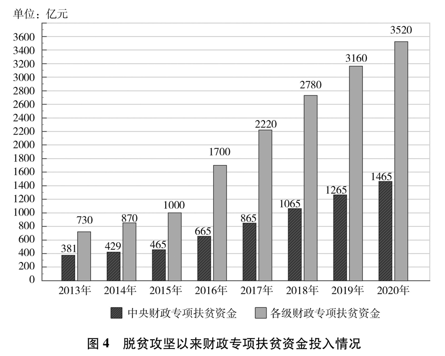 貧困地區(qū)發(fā)展條件差,貧困人口自我發(fā)展能力弱,消除貧困僅僅依靠個(gè)體、區(qū)域、民間等力量遠(yuǎn)遠(yuǎn)不夠,必須作為執(zhí)政黨和國(guó)家的責(zé)任,上升為國(guó)家意志、國(guó)家戰(zhàn)略、國(guó)家行動(dòng)。中國(guó)共產(chǎn)黨始終把消除貧困作為定國(guó)安邦的重要任務(wù),制定實(shí)施一個(gè)時(shí)期黨的路線方針政策、提出國(guó)家中長(zhǎng)期發(fā)展規(guī)劃建議,都把減貧作為重要內(nèi)容,從國(guó)家層面部署,運(yùn)用國(guó)家力量推進(jìn)。幾代中國(guó)共產(chǎn)黨人,錨定一個(gè)目標(biāo),一茬接著一茬干。中共十八大以來,中國(guó)共產(chǎn)黨把脫貧攻堅(jiān)擺在治國(guó)理政的突出位置,加強(qiáng)黨的集中統(tǒng)一領(lǐng)導(dǎo),統(tǒng)籌謀劃、強(qiáng)力推進(jìn)。從黨的領(lǐng)袖到廣大黨員干部,情系貧困群眾、心懷減貧大業(yè),全黨目標(biāo)一致、上下同心。加強(qiáng)頂層設(shè)計(jì)和戰(zhàn)略規(guī)劃,制定印發(fā)《關(guān)于打贏脫貧攻堅(jiān)戰(zhàn)的決定》《關(guān)于打贏脫貧攻堅(jiān)戰(zhàn)三年行動(dòng)的指導(dǎo)意見》等政策文件,明確目標(biāo)、路徑和具體措施并一以貫之抓下去。各級(jí)財(cái)政不斷加大投入力度(圖4),構(gòu)建多元資金投入體系(專欄12),為減貧事業(yè)發(fā)展提供資金保障。發(fā)揮社會(huì)主義制度集中力量辦大事的優(yōu)勢(shì),廣泛動(dòng)員各方力量積極參與。建立脫貧攻堅(jiān)責(zé)任體系、政策體系、組織體系、投入體系、動(dòng)員體系、監(jiān)督體系、考核評(píng)估體系等制度體系,為脫貧攻堅(jiān)順利推進(jìn)提供了有力支撐。