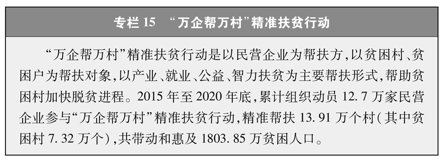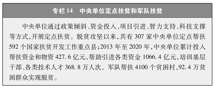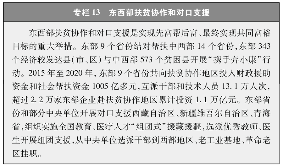 扶貧減貧是艱巨復(fù)雜的系統(tǒng)工程,需要調(diào)動(dòng)各方積極參與。為打贏脫貧攻堅(jiān)戰(zhàn),中國(guó)共產(chǎn)黨依托嚴(yán)密組織體系和高效運(yùn)行機(jī)制,廣泛有效動(dòng)員和凝聚各方力量,構(gòu)建政府、社會(huì)、市場(chǎng)協(xié)同推進(jìn),專項(xiàng)扶貧、行業(yè)扶貧、社會(huì)扶貧互為補(bǔ)充的大扶貧格局,形成跨地區(qū)、跨部門、跨單位、全社會(huì)共同參與的多元主體的社會(huì)扶貧體系。加強(qiáng)東西部扶貧協(xié)作和對(duì)口支援(專欄13),推動(dòng)省市縣各層面幫扶,促進(jìn)人才、資金、技術(shù)向貧困地區(qū)流動(dòng),實(shí)現(xiàn)優(yōu)勢(shì)互補(bǔ),縮小區(qū)域差距。積極開展定點(diǎn)扶貧,組織各級(jí)黨政機(jī)關(guān)、人民團(tuán)體、國(guó)有企事業(yè)單位和軍隊(duì)幫扶貧困縣或貧困村(專欄14)。各民主黨派、工商聯(lián)和無黨派人士充分發(fā)揮各自優(yōu)勢(shì),為打贏脫貧攻堅(jiān)戰(zhàn)獻(xiàn)智獻(xiàn)力。積極推動(dòng)各行各業(yè)發(fā)揮專業(yè)優(yōu)勢(shì),開展產(chǎn)業(yè)扶貧、科技扶貧、教育扶貧、文化扶貧、健康扶貧、消費(fèi)扶貧。廣泛動(dòng)員民營(yíng)企業(yè)參與扶貧開發(fā),引導(dǎo)市場(chǎng)開發(fā)能力強(qiáng)的主體進(jìn)入資源開發(fā)潛力大的地區(qū),實(shí)現(xiàn)互惠互利、共同發(fā)展(專欄15)。廣泛動(dòng)員社會(huì)組織、公民個(gè)人積極參與脫貧攻堅(jiān),開展扶貧公益活動(dòng)。設(shè)立國(guó)家扶貧日,建立脫貧攻堅(jiān)國(guó)家榮譽(yù)制度,表彰脫貧攻堅(jiān)先進(jìn)典型,營(yíng)造了人人愿為、人人可為、人人能為的社會(huì)幫扶氛圍。