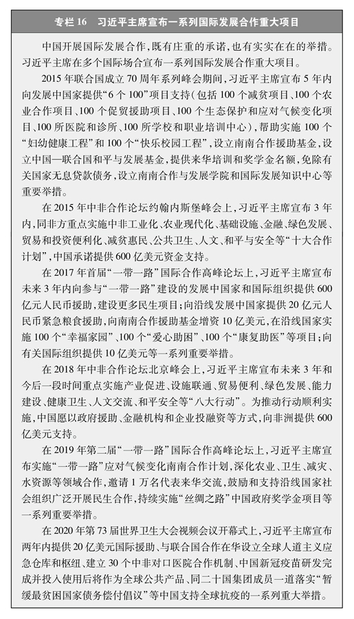支持廣大發(fā)展中國(guó)家減貧發(fā)展。新中國(guó)成立伊始,在國(guó)家百廢待興、財(cái)力緊張的情況下,即向有關(guān)國(guó)家提供援助,為發(fā)展中國(guó)家爭(zhēng)取民族獨(dú)立和解放、促進(jìn)經(jīng)濟(jì)社會(huì)發(fā)展提供了支持。改革開放后,中國(guó)對(duì)外援助內(nèi)容更加豐富、形式更加多樣,促進(jìn)了中國(guó)與其他發(fā)展中國(guó)家的共同發(fā)展。進(jìn)入新時(shí)代,中國(guó)擔(dān)負(fù)大國(guó)責(zé)任,推動(dòng)對(duì)外援助向國(guó)際發(fā)展合作轉(zhuǎn)型升級(jí),為破解全球發(fā)展難題、落實(shí)聯(lián)合國(guó)2030年可持續(xù)發(fā)展議程提出中國(guó)方案、貢獻(xiàn)中國(guó)智慧、注入中國(guó)力量。習(xí)近平主席在多個(gè)國(guó)際重大場(chǎng)合宣布中國(guó)開展國(guó)際發(fā)展合作的一系列務(wù)實(shí)舉措,已按期落實(shí)或正在按照進(jìn)度有序推進(jìn)(專欄16)。中國(guó)發(fā)起共建“一帶一路”倡議,推動(dòng)更大范圍、更高水平、更深層次的區(qū)域經(jīng)濟(jì)社會(huì)發(fā)展合作,支持幫助相關(guān)國(guó)家更好實(shí)現(xiàn)減貧發(fā)展。據(jù)世界銀行研究報(bào)告,共建“一帶一路”將使相關(guān)國(guó)家760萬人擺脫極端貧困、3200萬人擺脫中度貧困。新中國(guó)成立70多年來,中國(guó)向亞洲、非洲、拉丁美洲和加勒比地區(qū)、大洋洲和歐洲等地區(qū)160多個(gè)國(guó)家和國(guó)際組織提供多種形式的援助,減免有關(guān)國(guó)家債務(wù),為廣大發(fā)展中國(guó)家落實(shí)千年發(fā)展目標(biāo)提供幫助。