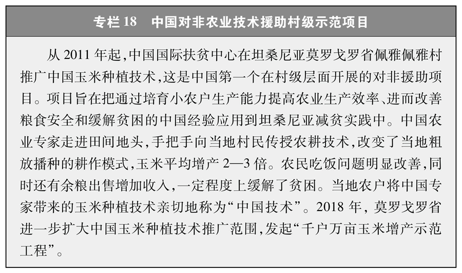 實(shí)施惠及民生的國(guó)際減貧合作項(xiàng)目。在亞洲地區(qū),中國(guó)與東盟國(guó)家共同開展鄉(xiāng)村減貧推進(jìn)計(jì)劃,在老撾、柬埔寨、緬甸三國(guó)鄉(xiāng)村基層社區(qū)實(shí)施“東亞減貧示范合作技術(shù)援助項(xiàng)目”(專欄17)。在非洲地區(qū),中國(guó)為非洲國(guó)家援建水利基礎(chǔ)設(shè)施、職業(yè)技術(shù)學(xué)校、社會(huì)保障住房等設(shè)施,打造農(nóng)業(yè)合作示范區(qū),推進(jìn)實(shí)施中非菌草技術(shù)合作、中非友好醫(yī)院建設(shè)、非洲疾控中心總部建設(shè)等項(xiàng)目(專欄18)。在南太平洋地區(qū),中國(guó)推動(dòng)落實(shí)對(duì)太平洋島國(guó)無償援助、優(yōu)惠貸款等舉措,開展基礎(chǔ)設(shè)施建設(shè)和農(nóng)業(yè)、醫(yī)療等技術(shù)合作援助項(xiàng)目。在拉美地區(qū),援建農(nóng)業(yè)技術(shù)示范中心,幫助受援國(guó)當(dāng)?shù)孛癖姅[脫貧困。中國(guó)還與聯(lián)合國(guó)教科文組織合作設(shè)立國(guó)際農(nóng)村教育研究與培訓(xùn)中心等機(jī)構(gòu),面向非洲、東南亞等國(guó)家實(shí)施農(nóng)村教育轉(zhuǎn)型、教師培訓(xùn)等項(xiàng)目。